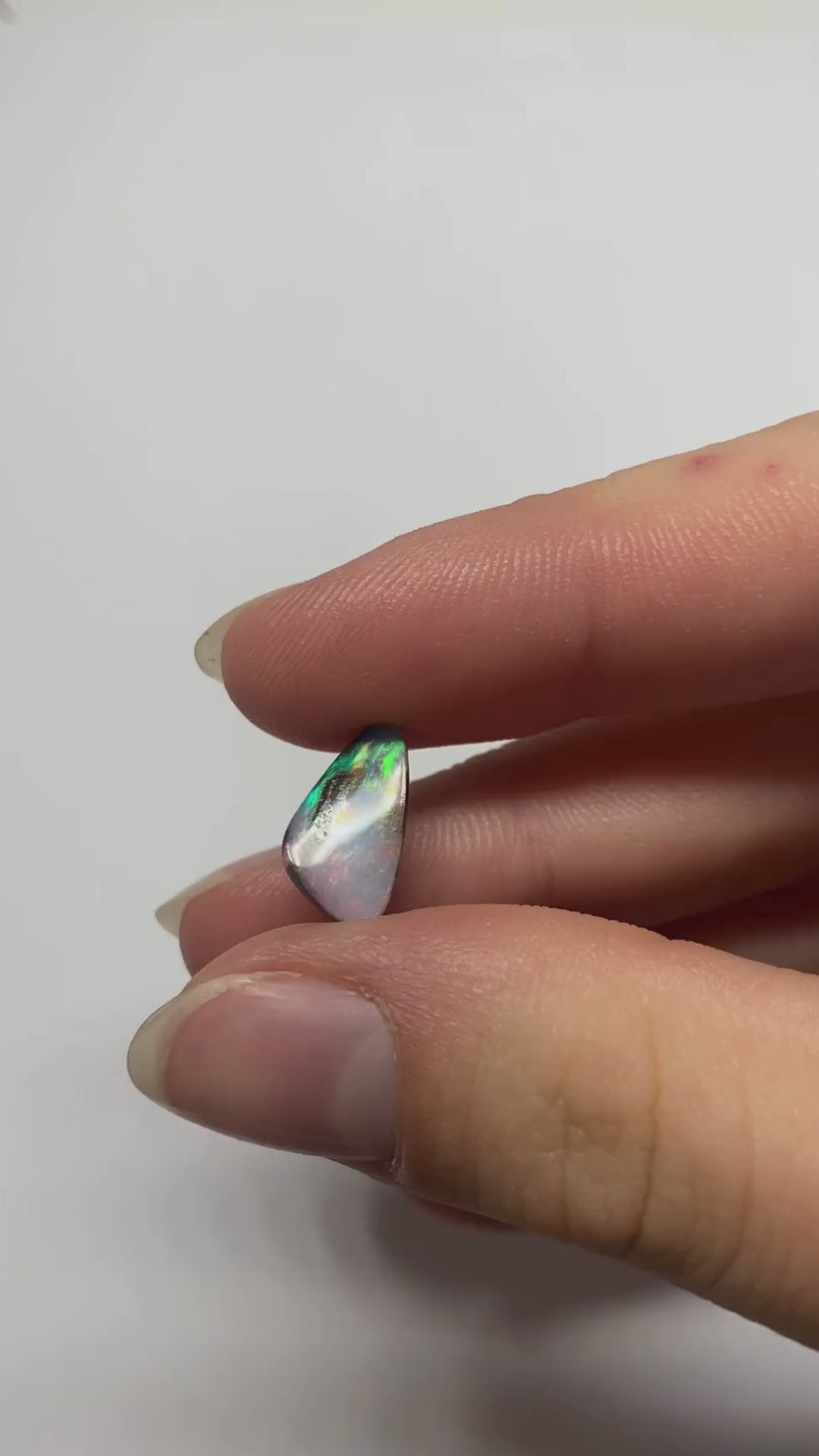 Experience the ethereal beauty of the Northern Lights with a ring made from this stunning opal. Its vibrant green and pinky purple hues will capture your heart, while the small bits of ironstone add a touch of unique character. The triangular shape adds even more interest to this already captivating gemstone.