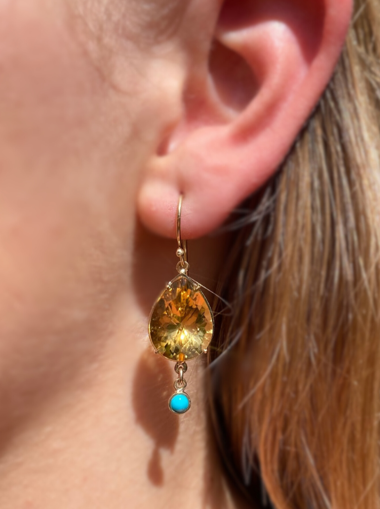 Indulge in elegance with our Desert Spring Citrine and Turquoise Earrings. The pear-shaped citrine drops and small turquoise feature are set in handmade 9ct yellow gold, creating a stunning contrast of bright blue and yellow.