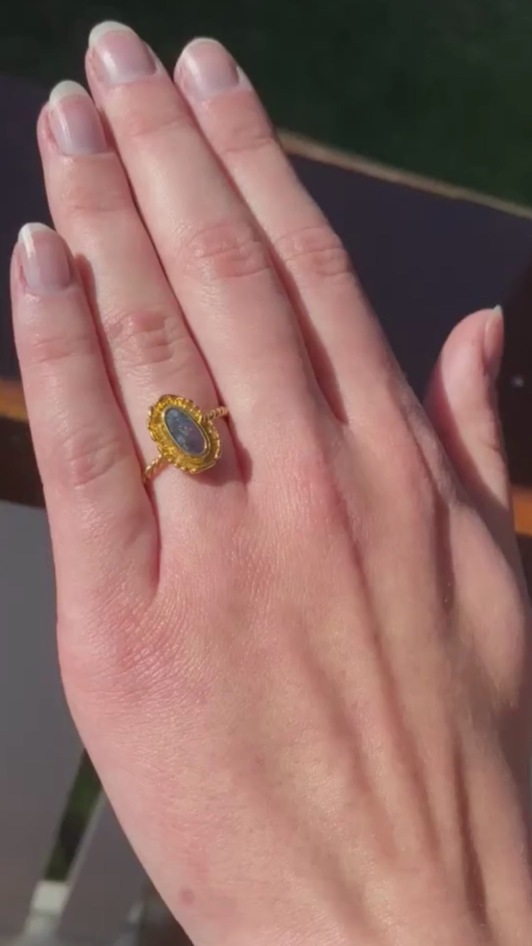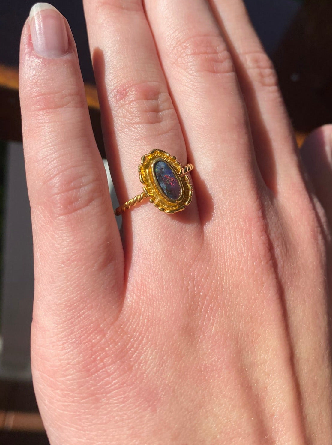 Beautiful dainty ring, eye popping 22ct gold set with a vibrant red, blue and green boulder opal. Unique style, handmade, one of a kind ring! Ready to wear every day!