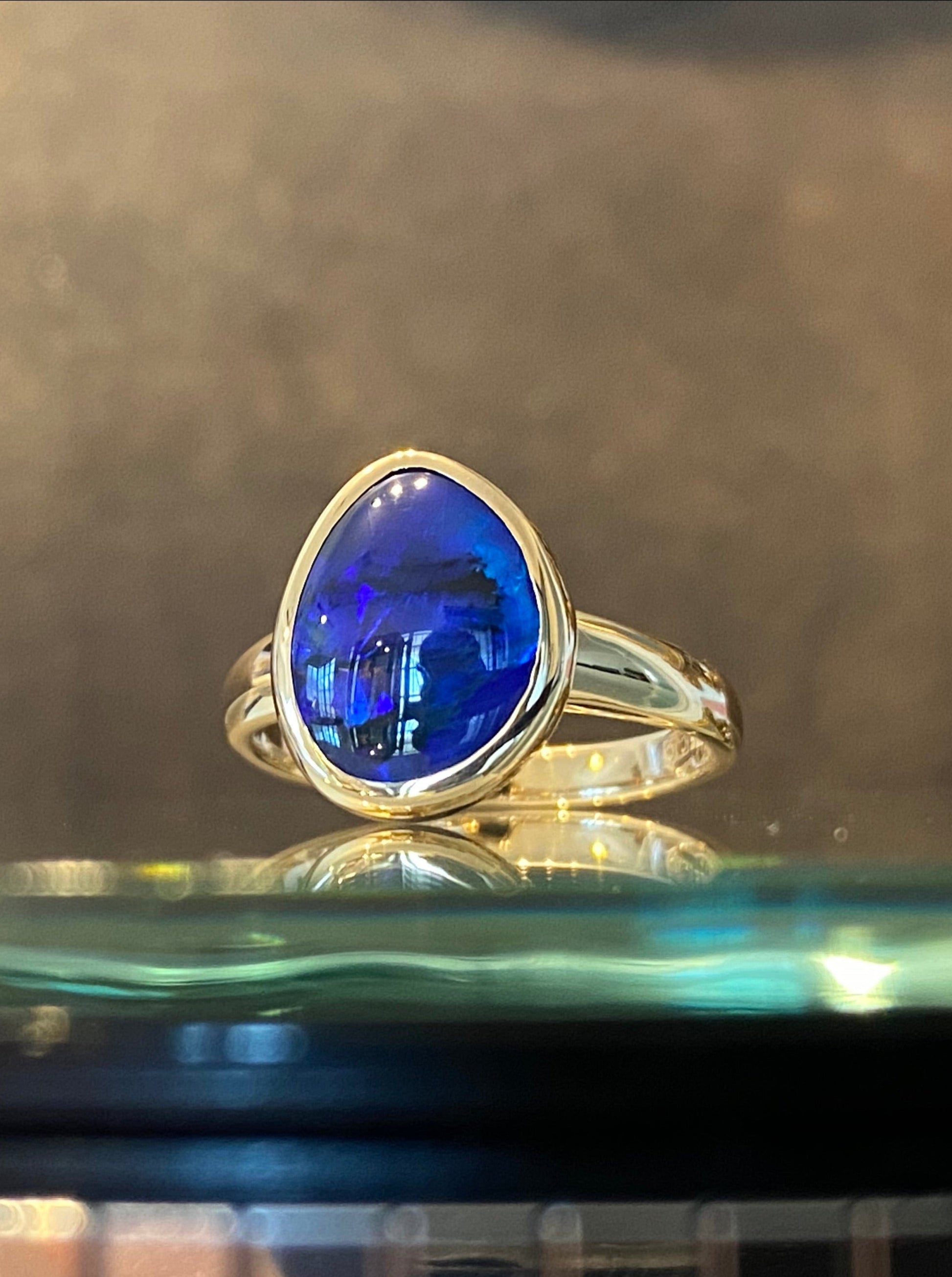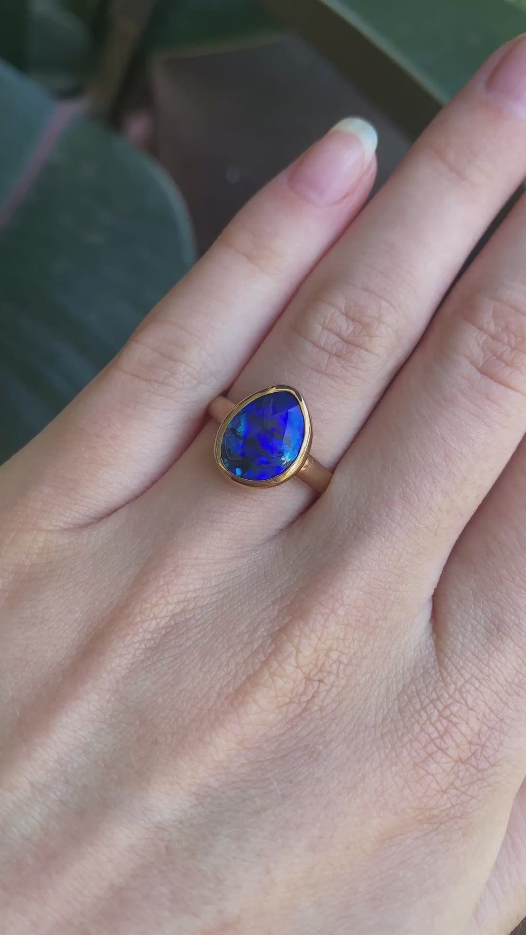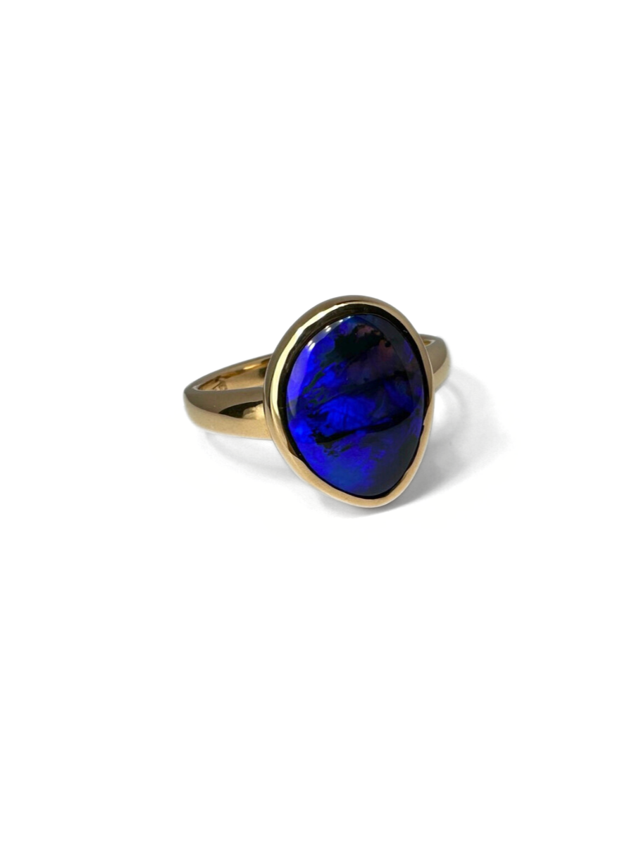 We have chosen a smooth bezel style setting for this opal to accentuate the gem’s organic shape and show off maximum colour.