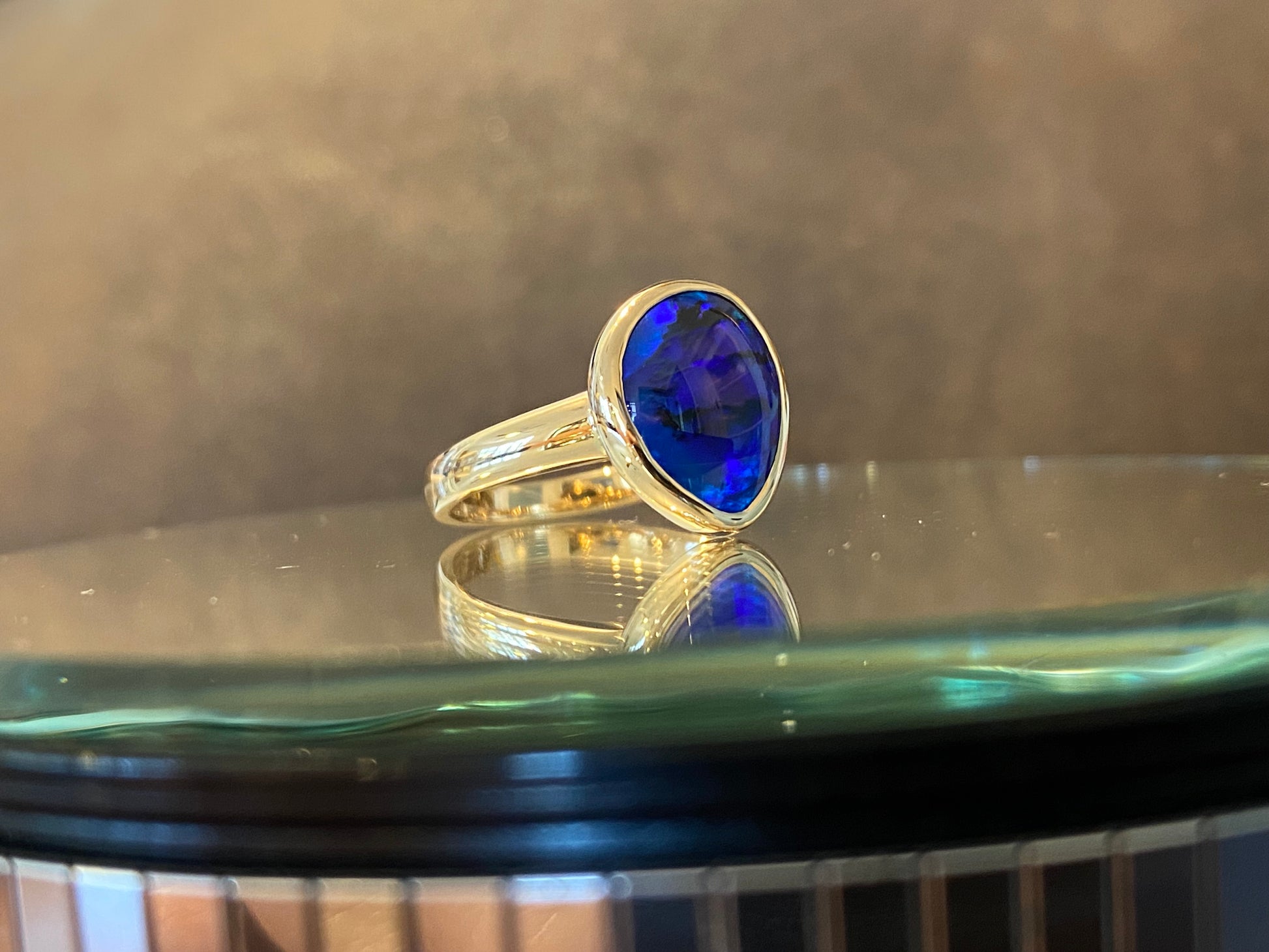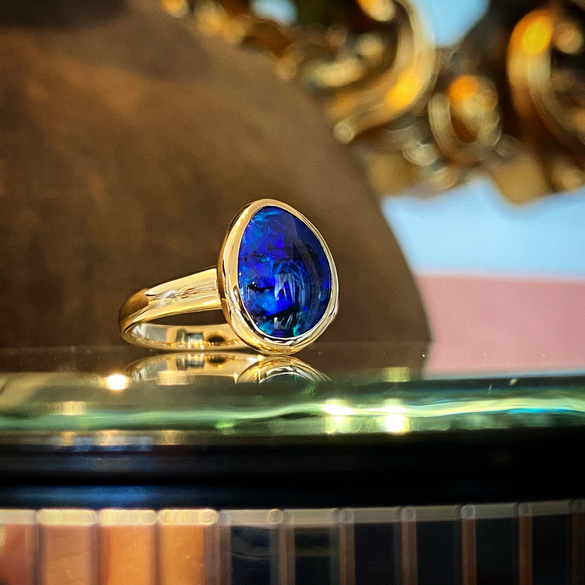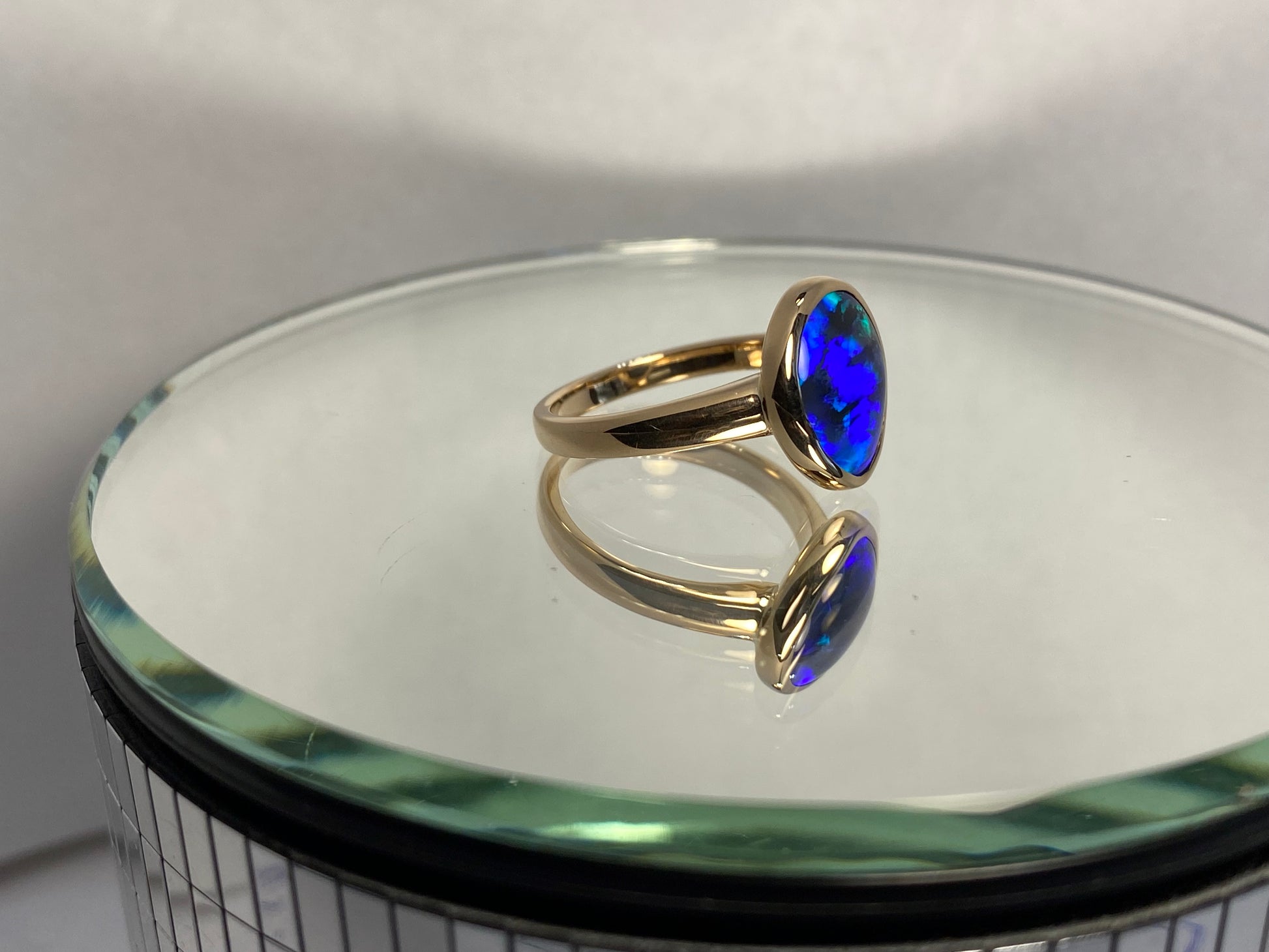 We have chosen a smooth bezel style setting for this opal to accentuate the gem’s organic shape and show off maximum colour.