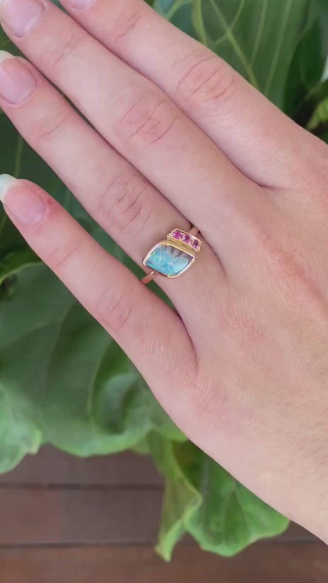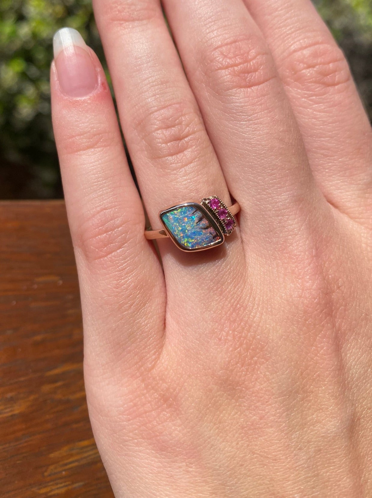 Featuring a magnificently vibrant 1.9ct Queensland Boulder Opal paired beautifully with a total of 0.09ct pink sapphires. These colourful stones are complimented with a handmade 9ct pink gold band and setting to bring the whole look together.