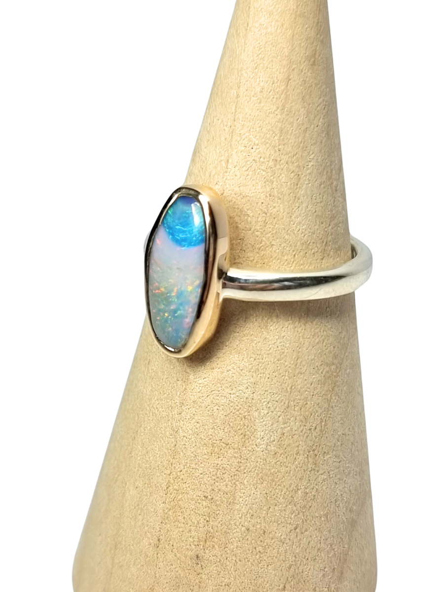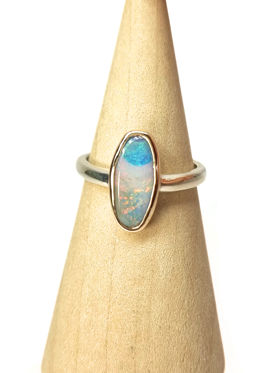 A bright blue beginning melds to an orange fizz mist in this natural Queensland Boulder Opal ring. We have set this opal in a handmade 9ct Yellow Gold setting with a silver band. Smooth lines follow the natural shape of the opal.