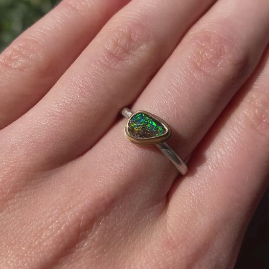 The Solar Tide Opal Ring captures the meeting of sunlight and sea. The natural opal displays vivid green and blue colours with flashing shimmers of yellow and red. It's display is like sunlight rippling over ocean waves.