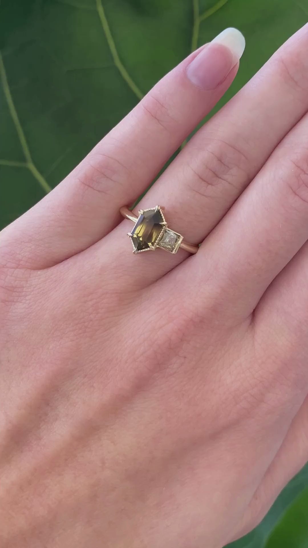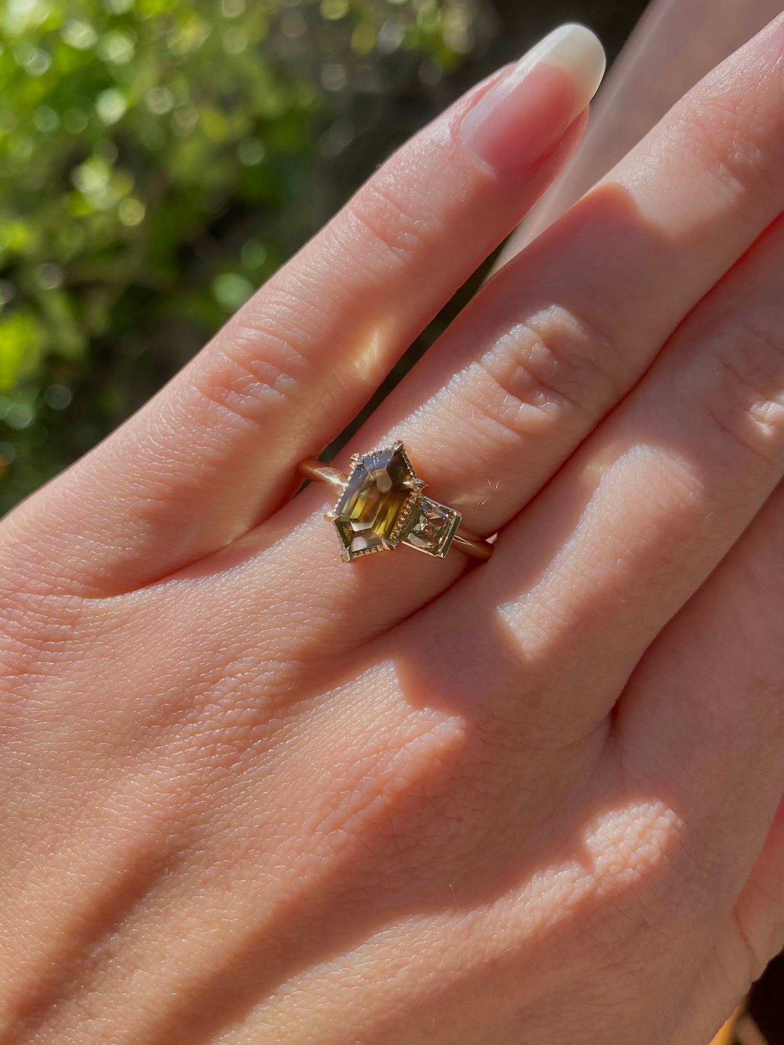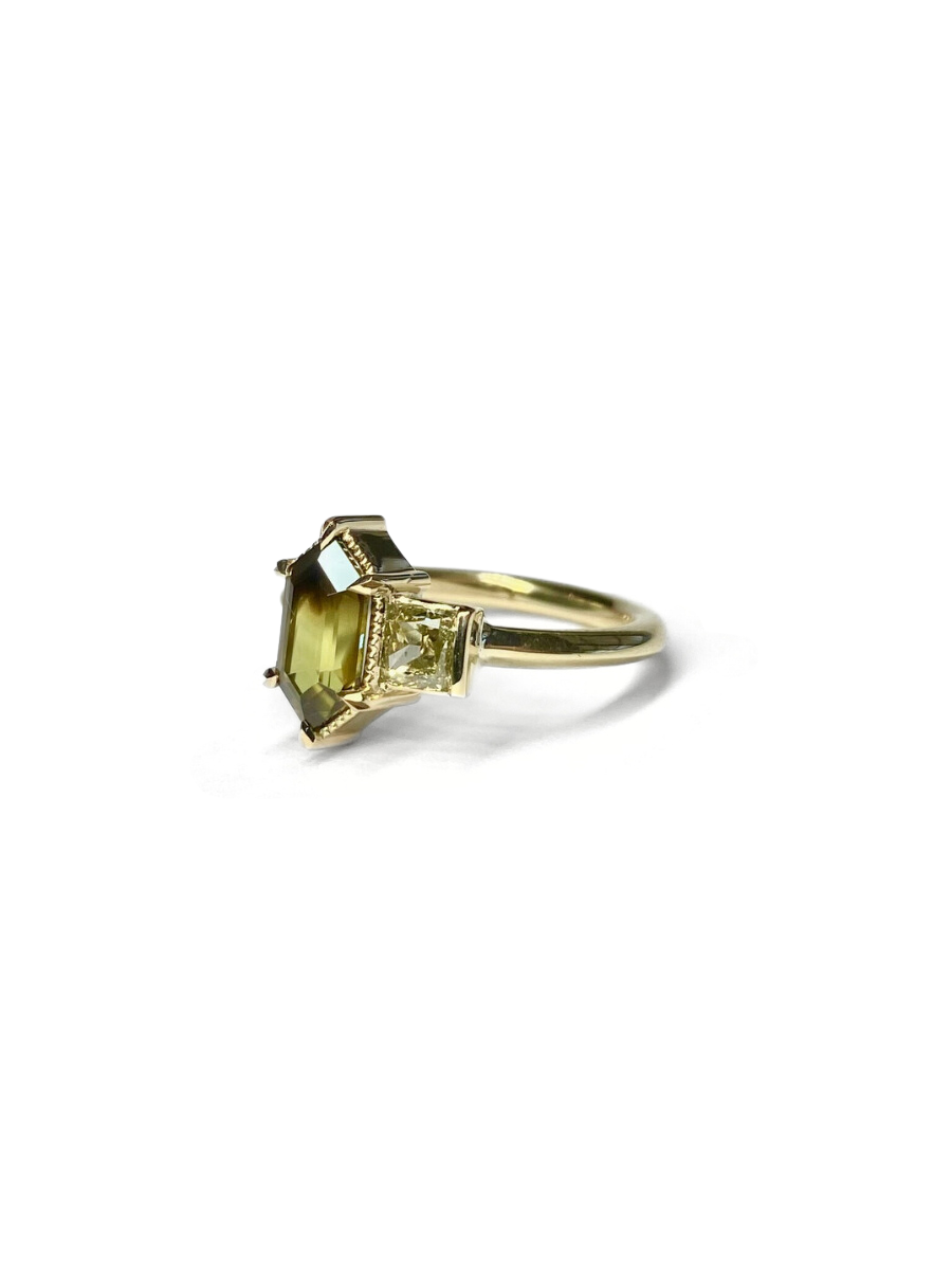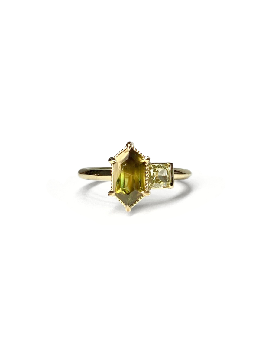 Introducing our exquisite alternative engagement ring, the epitome of elegance and sophistication. Handcrafted in luxurious 9ct yellow gold, its unique design exudes class, featuring a radiant 1.61ct elongated hexagon-cut yellow-green natural sapphire, reminiscent of a sunlit meadow at dusk. Complemented by a dazzling 0.36ct yellow diamond, this ring captures the essence of romance and beauty, perfect for those seeking a timeless symbol of love.