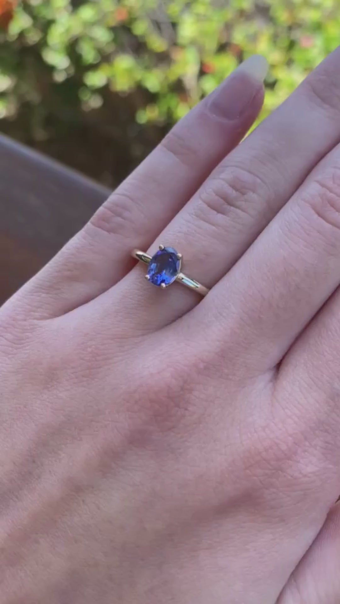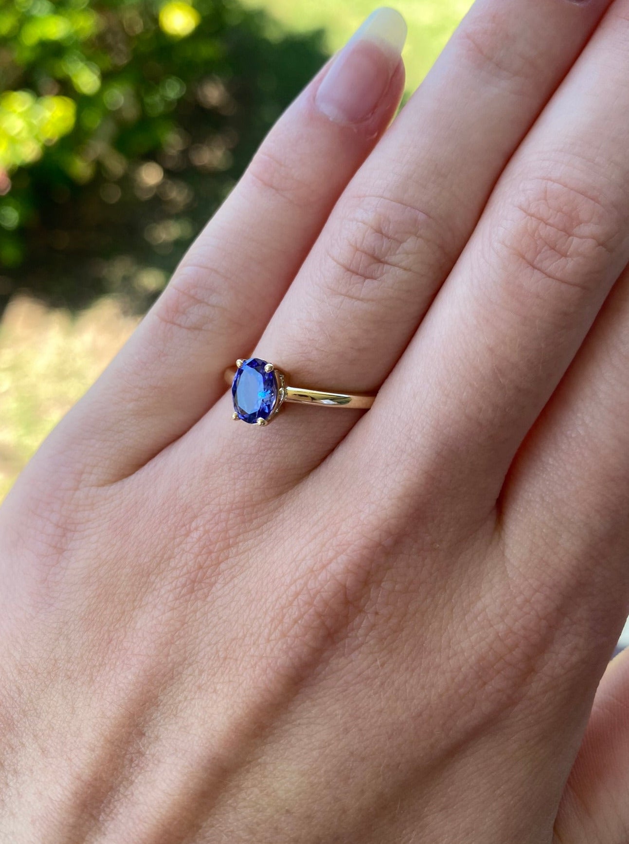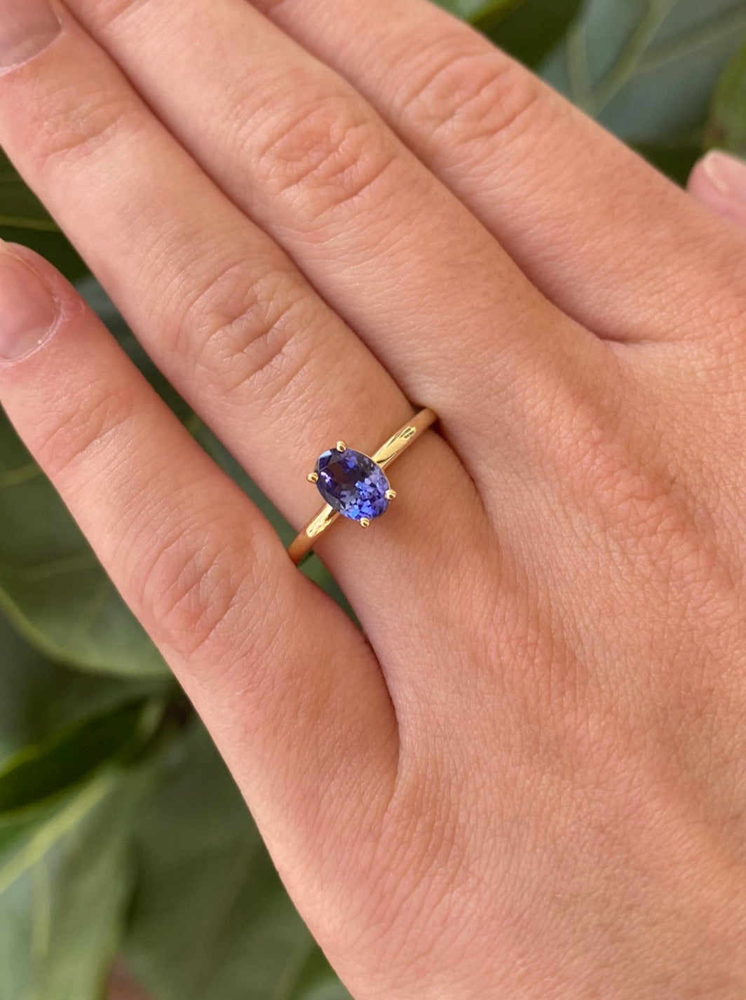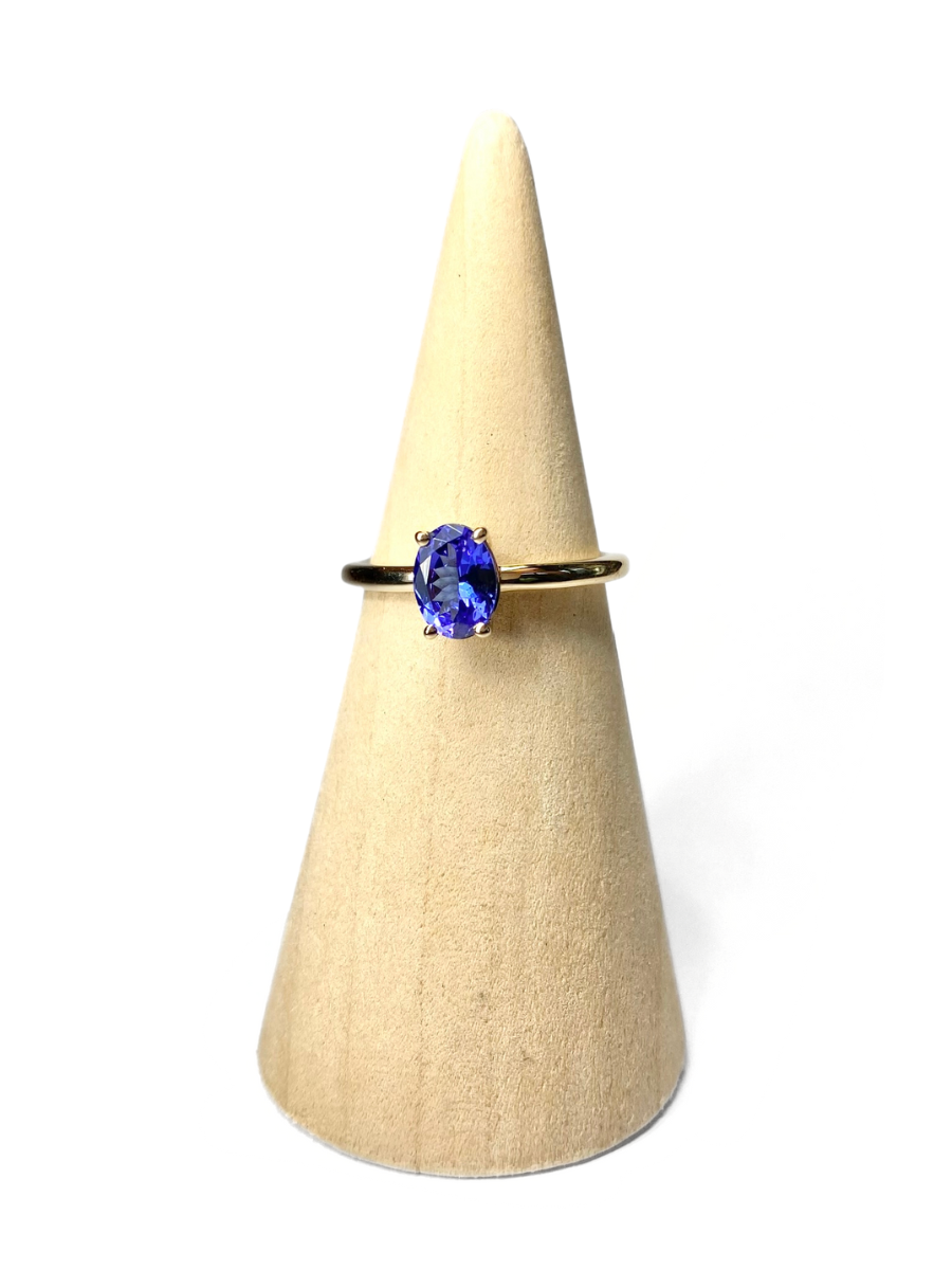 The oval cut tanzanite is set in a handmade 4 claw setting in the 9ct yellow gold band.